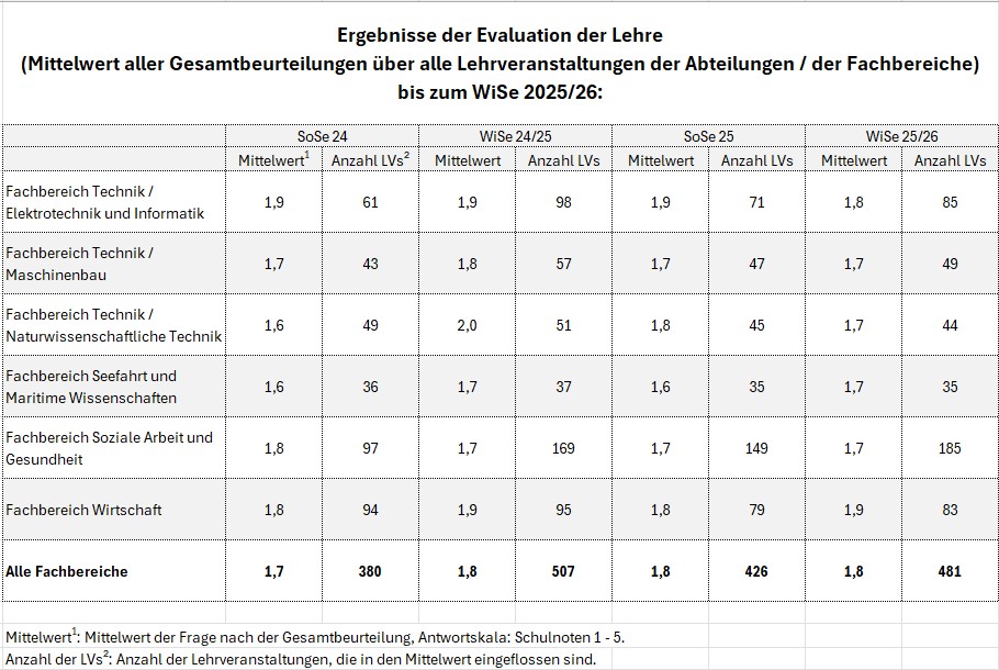 Ergebnisse der Evaluation der Lehre (Mittelwert aller Gesamtbeurteilungen über alle Lehrveranstaltungen der Abteilungen / der Fachbereiche) bis zum WiSe 2025/2026: