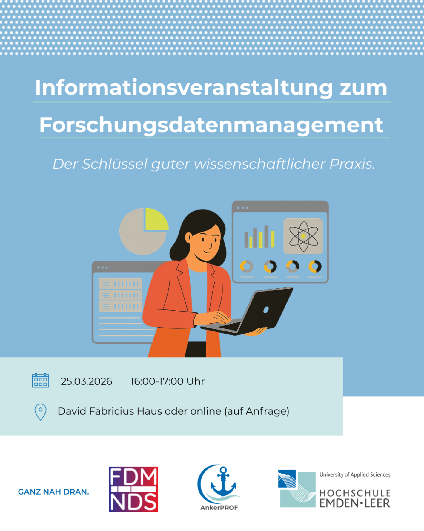 Die Veranstaltung wird vom AnkerPROF-Team gemeinsam mit dem Data Steward der Bibliothek, Vanessa Bischoff, organisiert und als Hybridformat angeboten; eine Teilnahme ist vor Ort oder online (auf Anfrage per E-Mail an ankerprof@hs-emden-leer) möglich.