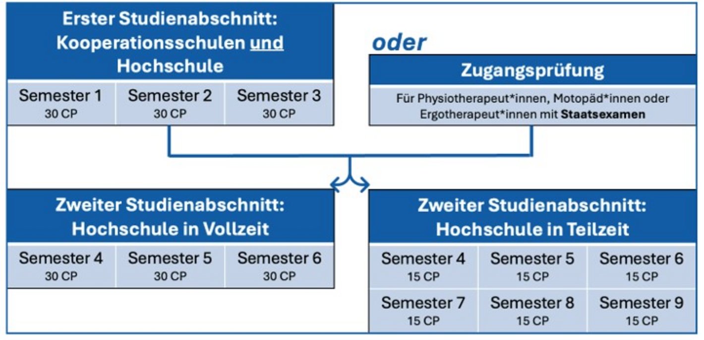 - Studienabschnitt 1: Semester 1 bis 3 (Teilzeit) parallel zur Ausbildung in Physio- oder Ergotherapie oder Motopädie
