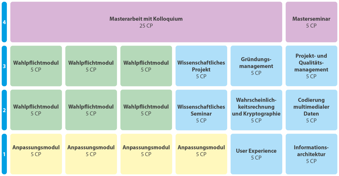 - Informatikmodule im Umfang von mindestens 60 Kreditpunkten (ECTS) enthalten und der individuelle Studienverlauf einen deutlichen Bezug zum Thema Medien aufweist oder
