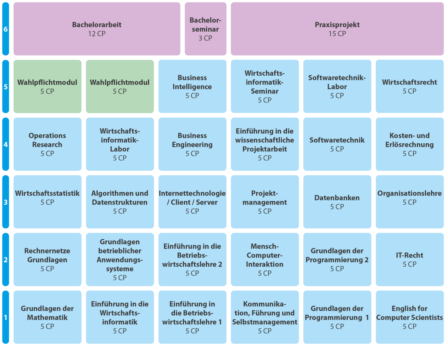Dazu kommen das Praxisprojekt und die Bachelorarbeit mit jeweils 15 ECTS-Punkten.