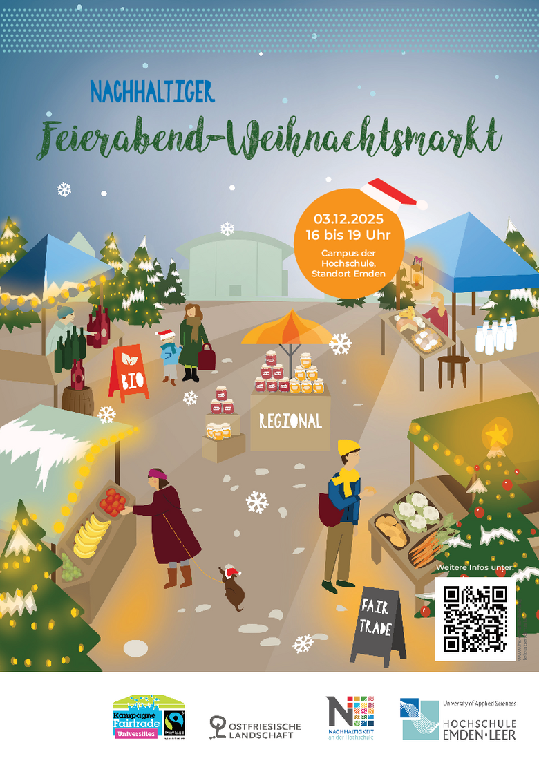 Zweimal im Jahr findet auf dem Campus der Hochschule in Emden ein nachhaltiger Feierabendmarkt statt. In entspannter Atmosphäre und nach Feierabend werden dort ökologische, regionale und faire Produkte von Anbieterinnen und Anbietern aus Ostfriesland zum Kauf angeboten. Die Vorzüge der Region in Sachen regionaler und nachhaltiger Landwirtschaft können so von unseren Studierenden und Mitarbeitenden sowie von BesucherInnen aus der Stadt direkt genutzt werden. Daneben präsentieren sich nachhaltige Hochschulprojekte und zivilgesellschaftliche Initiativen.
