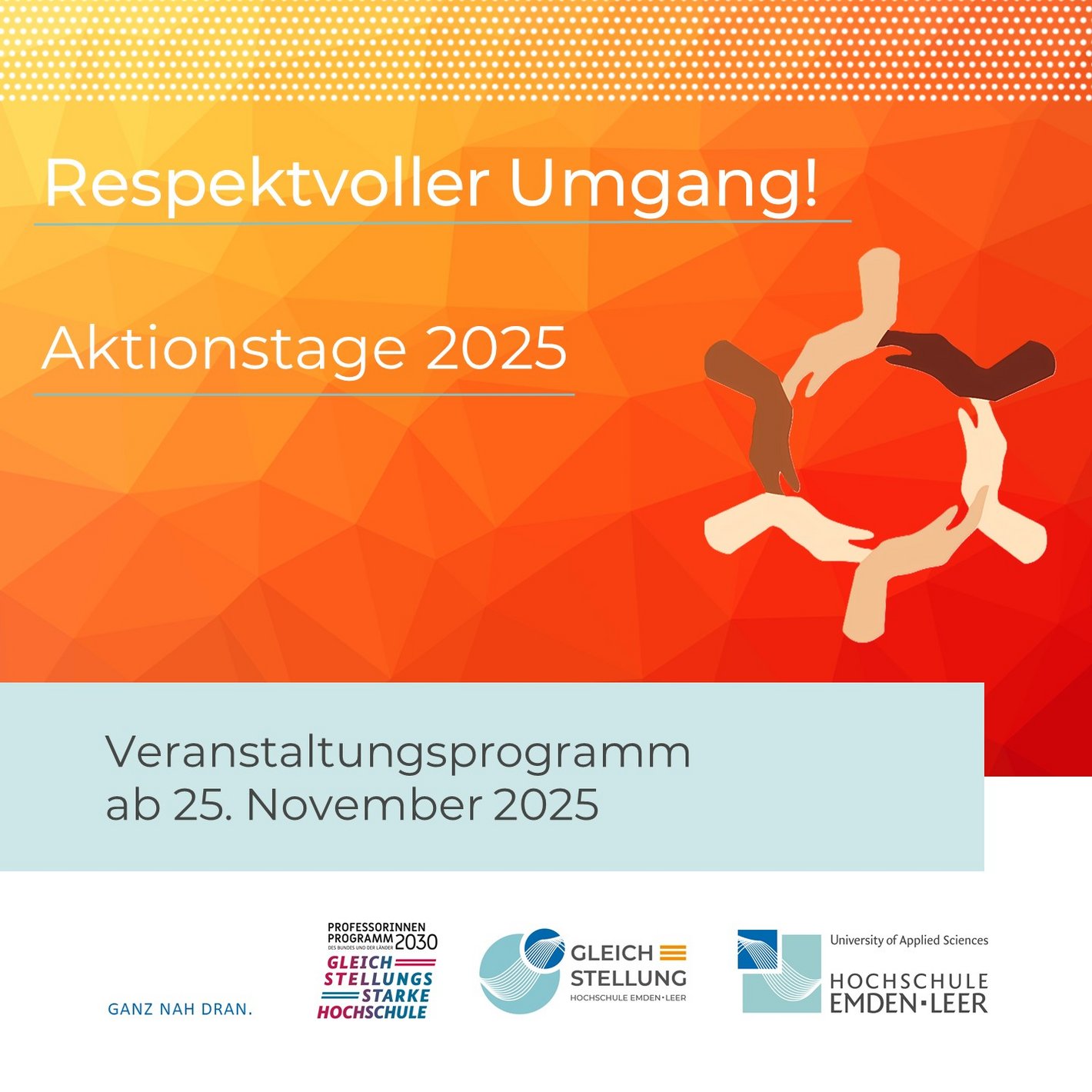 Die Hochschule begleitet die vielfältigen Aktionen der Stadt Emden, die wie jedes Jahr zum sogenannten „Orange Day“ ein Zeichen setzt, dass Gewalt gegen Frauen und Mädchen in Emden keinen Platz hat.Es finden im November wieder zahlreiche Veranstaltungen statt, um auf dieses Thema aufmerksam zu machen, eine klare Haltung gegen Gewalt einzunehmen und Solidarität mit Betroffenen zu zeigen. Ein Überblick zu den Aktionen gibt es auf der Website https://www.emden.de/rathaus/verwaltung/stabsstellen/gleichstellungsbeauftragte/orangeday.