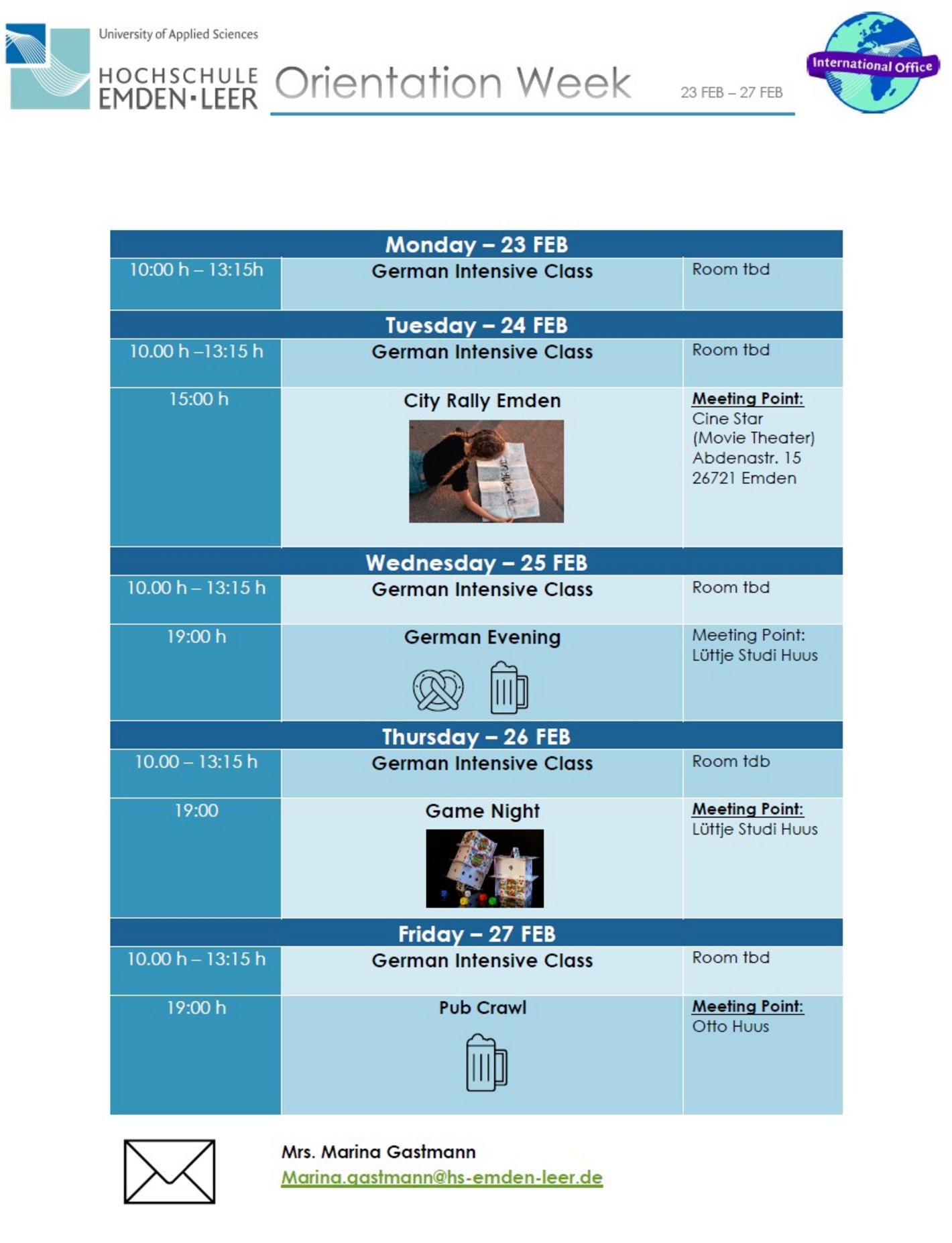 Solltet ihr neu an unserer Hochschule sein und Interesse haben, an dieser Orientierungswoche teilzunehmen, meldet euch gerne bei Frau Marina Gastmann (marina.gastmann(at)hs-emden-leer.de).