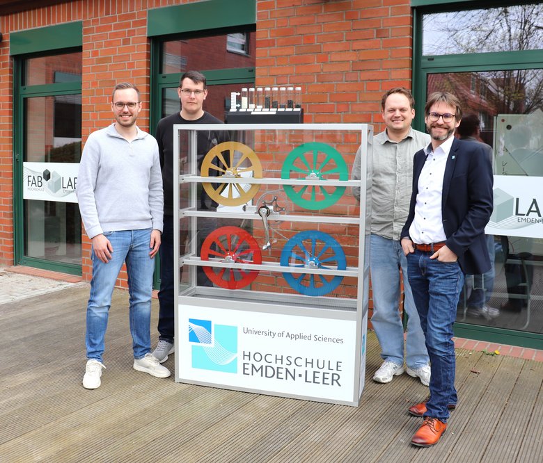 Das Team der Hochschule (v.l.: Nils Thoben, Timo Knöner, Tobias Lankenau und Prof. Dr. Matthias Graf) konstruierte für die Hannover Messe am Campus Emden neben einem Tribometer mit integrierter Kamera auch einen Reibungsdemonstrator, der den Einsatz mehrerer unterschiedlicher Schmierstoffe verdeutlicht.