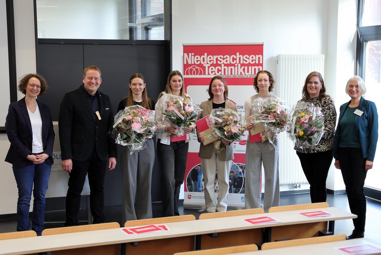 Katrin Keller (v.l., Wissens- und Technologietransfer Jade Hochschule), Dirk Rabe (Dekan Fachbereich Technik), Lina Reents, Lea Schwarz, Lea Marie Schmies, Charlotte Dreesmann, Pauline Elenberger (Koordination Niedersachsen-Technikum) und Jutta Dehoff-Zuch (Zentrale Gleichstellungsbeauftragte Hochschule Emden/Leer).