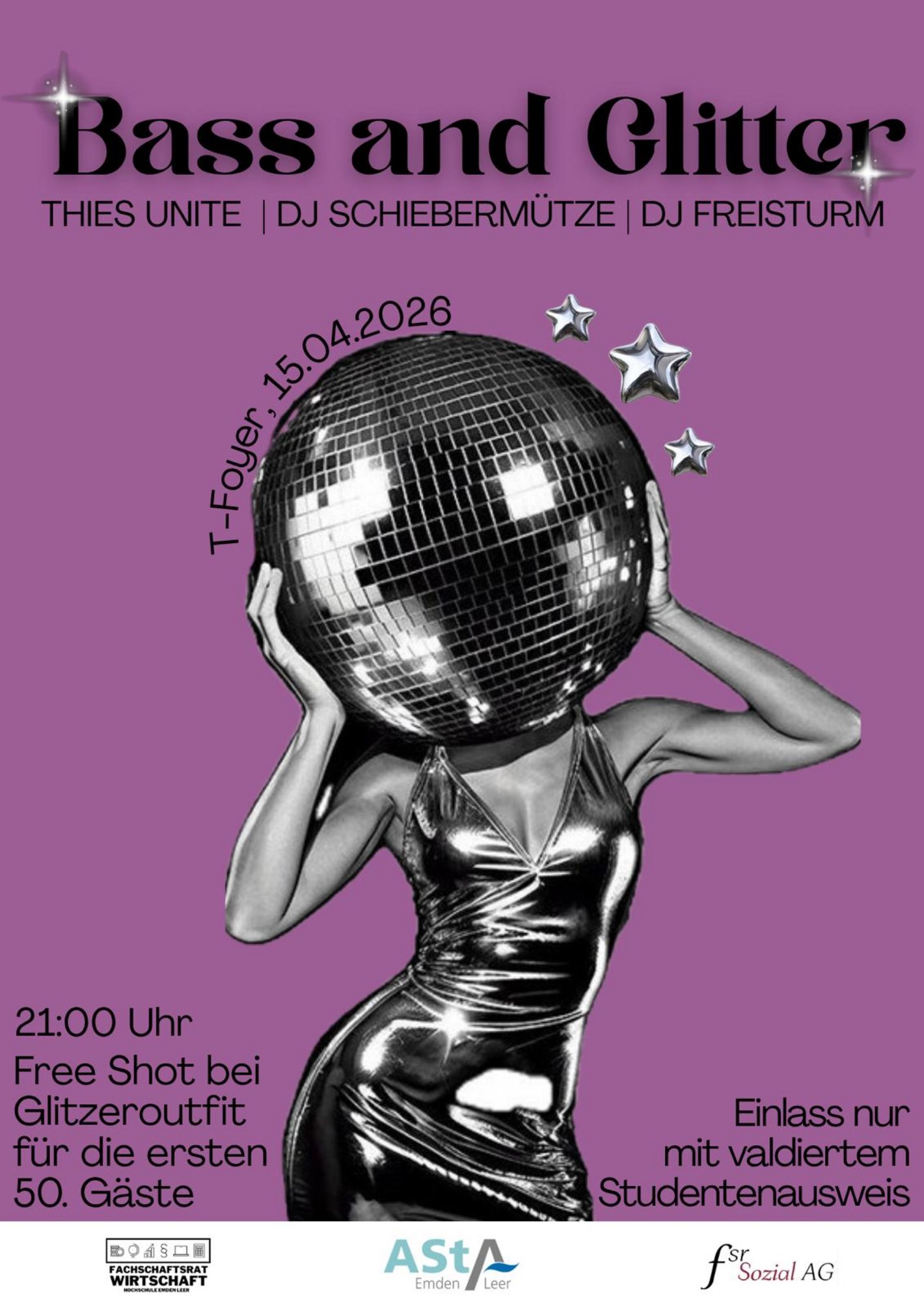 Unser Motto: “Bass and Glitter”. Als DJs sind Thies Unite, DJ Schiebermütze und DJ Freisturm am Start.