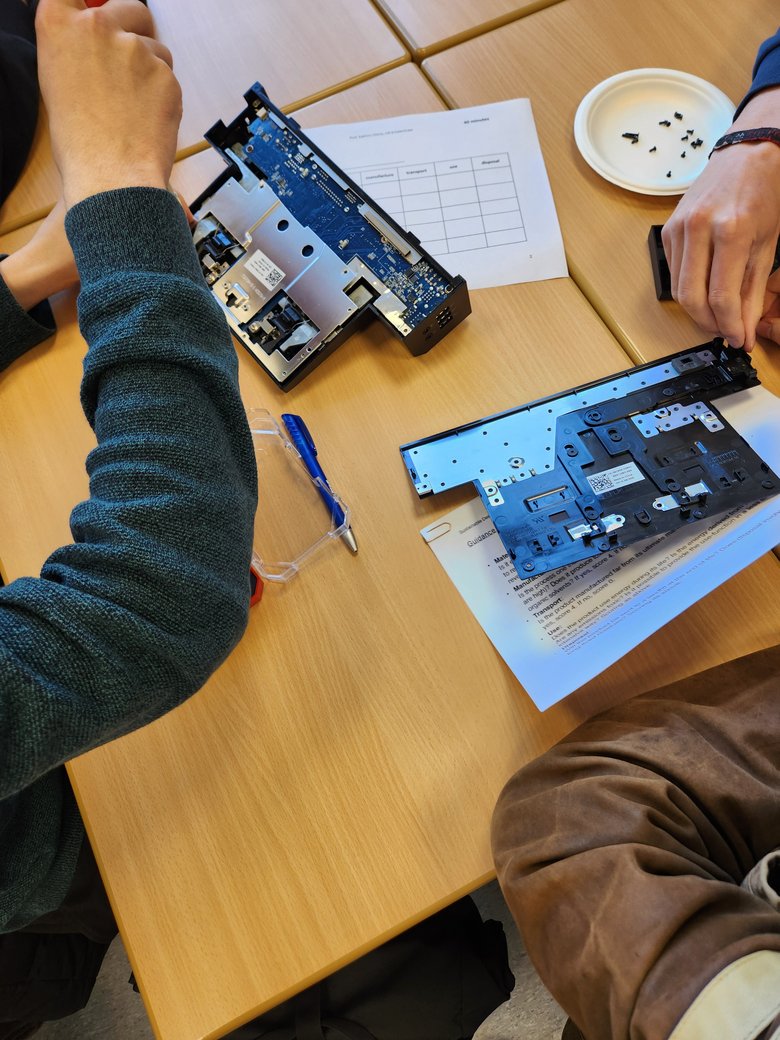 In einem Workshop wurden technische Produkte zerlegt und auf Reparierbarkeit und Recycling hin untersucht. Eine Parallelgruppe bearbeitete das Thema Textilien und setzte Ideen zum Up- und Downcycling von gebrauchten Textilien in ersten Entwürfen um. Besonders bei elektronischen Geräten fiel auf, dass viele Komponenten fest verbaut und schwer reparierbar sind – oft sogar durch spezielle Schrauben erschwert. Die Teilnehmenden recherchierten zudem, wie der Begriff Nachhaltigkeit heute in Medien und Unternehmen verwendet wird. Ein weiterer praktischer Teil des Workshops bestand darin, den eigenen CO₂-Fußabdruck zu berechnen.