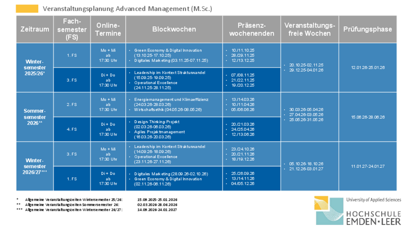 - Prüfungsphase: Die letzten 2 Wochen pro Semester sind für die Modulprüfungen reserviert.