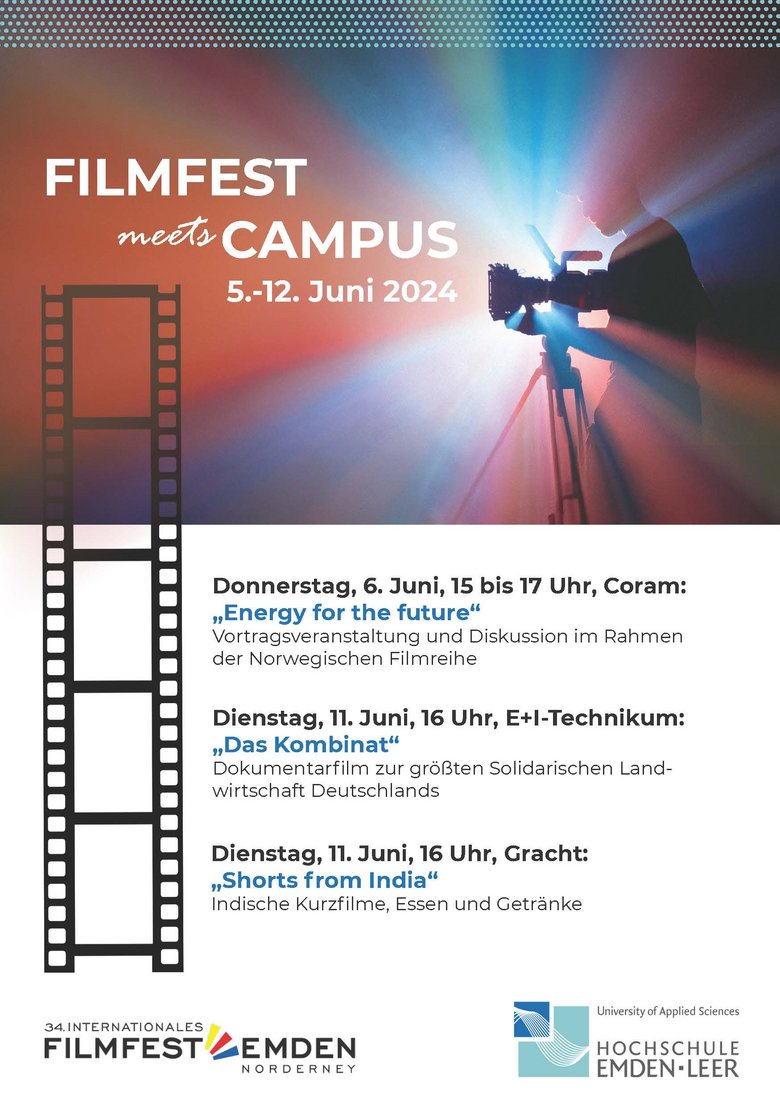 Unter dem Motto „Filmfest meets Campus“ lädt die Hochschule Emden/Leer für Dienstag, 11. Mai, im Rahmen des internationalen Filmfestes Emden-Norderney ein. Neben Filmvorführungen, die auch durch Studierende des Studiengang Medientechnik betreut werden, wird zusätzlich ein kulinarisches Rahmenprogramm in sommerlicher Campusatmosphäre geboten.