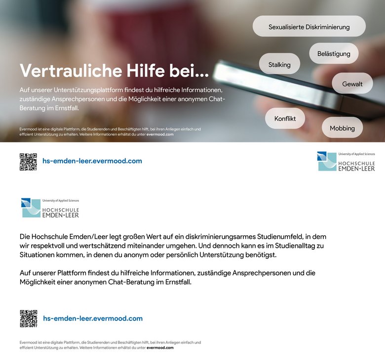 Hilfreiche Informationen u.a. zum Thema sexualisierte Diskriminierung und Gewalt sowie die Möglichkeit einer anonymen Chatberatung finden Sie auf unserer Unterstützungsplattform Evermood. Diese digitale Assistenz wurde von der Gleichstellungsstelle zusammen mit den Vertrauenspersonen gegen sexualisierte Diskriminierung und Gewalt eingerichtet, um ein möglichst diskriminierungsarmes Studienumfeld zu gestalten.